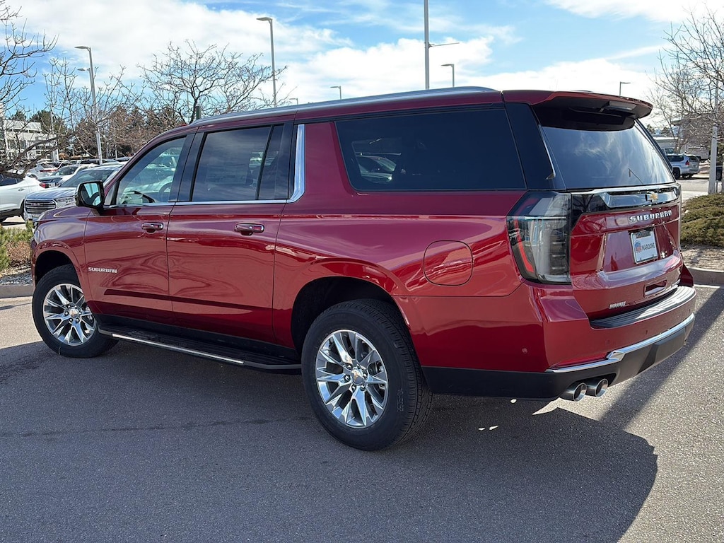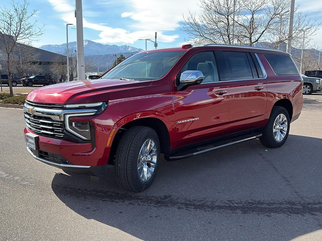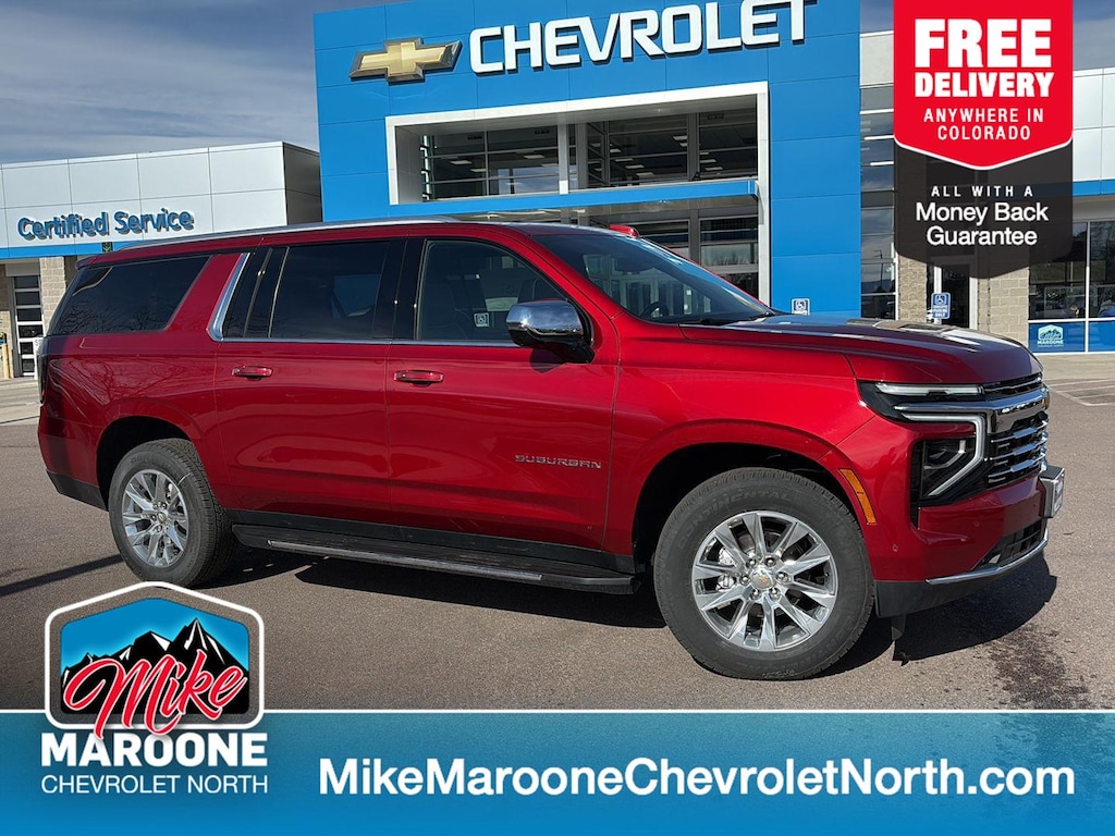This New 2025 Chevrolet Suburban Premier, is Radiant Red Tintcoat in color with an Jet Black interior. Stock Number N367691. You can connect with us by calling (719) 249-2703. Chevrolet Consumer Cash Program Not available with special financing, lease and some other offers. See dealer for details. ($1000) Expires: 03/03/2026 Max Trailering PackageHill Descent ControlIntegrated Trailer Brake Controller2-Speed Active Electronic Autotrac Transfer CaseAdvanced Trailering PackageHitch View with Pan/zoom Image AdjustmentSmart Trailer Integration IndicatorBlind Zone Steering Assist with TraileringPreferred Equipment Group 1LZMemory SettingsFront Bucket Seats8-Way Power Front Passenger Seat Adjuster3rd Row 60/40 Power-Folding Split-BenchPower Release 2nd Row Bucket Seats4-Way Power Driver Lumbar Seat Adjuster4-Way Power Front Passenger Lumbar Seat AdjusterChrome Door Handles with Body-Colour Strip7,700 lbs (3,493 Kgs) GVWRBright Front and Rear Door Sill PlatesPower-Sliding Centre Floor ConsoleAuto-Dimming Inside Rearview MirrorChrome Mirror CapsHeated Power-Adjustable Outside Mirrors3.23 Rear Axle RatioWireless Phone ChargingHeated Driver and Front Passenger SeatsHeated 2nd Row Outboard SeatsHeated Steering WheelPerforated Heated and Ventilated SeatsDual Exhaust SystemPower Tilt and Telescopic Steering Column20" X 9" Polished Aluminum WheelsPerforated Leather Seating SurfacesFront LED Fog LampsLED Tail LampsRear Power LiftgateLED Headlamps with LED Daytime Running LampsUniversal Home RemoteBose 10-Speaker Surround with CenterPoint17.7" Diagonal Advanced Colour LCD Display275/60R20SL All-Season Blackwall TiresMagnetic Ride Control SuspensionSun and Tow Package ($2,365 value)Dual-Pane Power Panoramic SunroofPremium Liner Protection Package ($760 value)First and Second Rows Premium Floor LinersAll-Weather Cargo Mat3rd Row All-Weather Floor Liners Safety and Security Forward collision mitigation - Forward thinking. You look away for just a second and suddenly the vehicle in front of you has stopped. That's when the forward collision mitigation system comes to life. When it senses an impending impact, it will activate a combination of features to help prevent or reduce the severity of an accident. Forward collision mitigation is always looking ahead. Pedestrian impact prevention - An extra step toward safety. Pedestrians don't always stop, look, and listen, but with Pedestrian Impact Prevention, your vehicle is equipped to better see them and avoid them. This system constantly monitors the road ahead to identify and track pedestrians. It projects that image to an interior display screen, AND should an impact become likely, Pedestrian impact prevention takes steps to avoid a collision. Rear camera with washer - Watching your back! The rear camera helps you see obstacles and hazards you otherwise couldn't by showing enhanced images of what is behind you. Even if there are sloppy conditions, the washer keeps the camera's view clean. Rear camera with washer is an extra set of eyes that's both convenient and safeTechnology and Telematics Apple CarPlay/Android Auto smart device wireless mirroring Mobile hotspot - WiFi on the fly. Connect your devices to the Internet through your vehicles private mobile hotspot and take the internet wherever your journey takes you, without eating up your data allowance. Find the hotspot with mobile hotspot. FINANCING OPTIONS: Take advantage of our attractive low-rate financing options. Our access to various Credit Unions and National Banks can provide financing for most credit levels. We can tailor a finance package to fit your needs. To get started, complete our secure online credit application. FREE DELIVERY ANYWHERE IN COLORADO. Our dealerships sell more Chevrolets than any single dealership in the state. We have the largest Chevy inventory of Trax and highest customer satisfaction. At Mike Maroone, if you dont like it ... Bring it back! For more information or vehicles like it, stop by Mike Maroone North toda