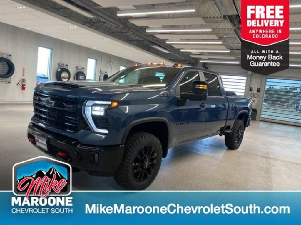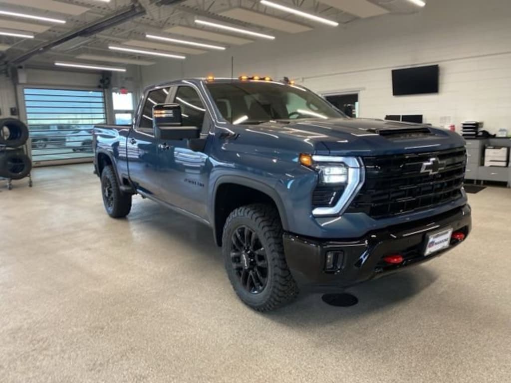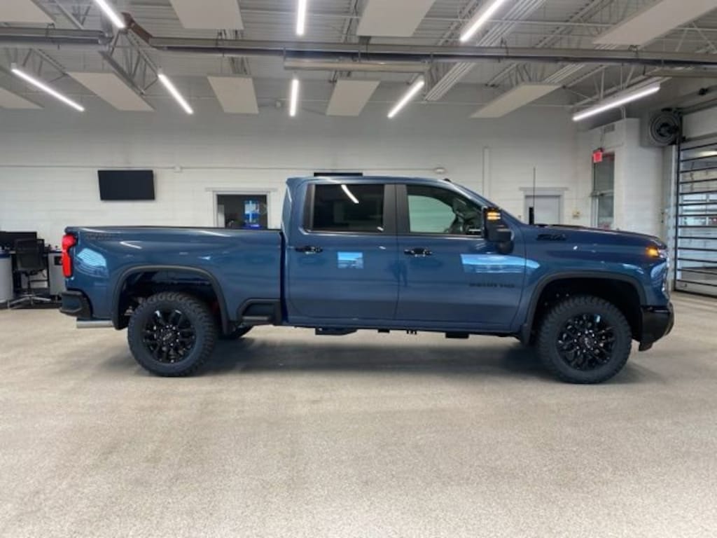 The bold, muscular exterior of the Silverado 2500HD LT commands attention, with its distinctive Chevrolet styling and rugged design cues. The Blue paint finish, paired with the Black Chevytec spray-on bedliner and high-gloss Black accents, creates a striking and sophisticated appearance.