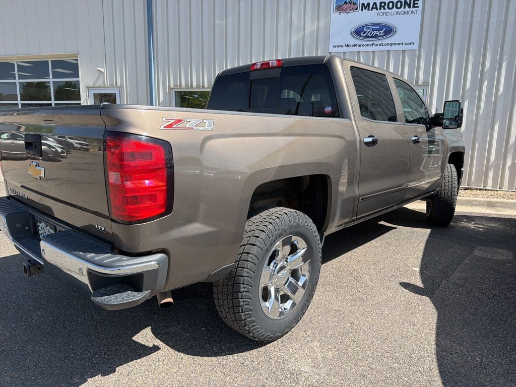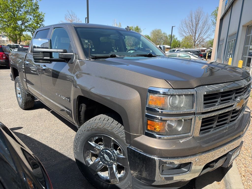 CARFAX One-Owner. FREE DELIVERY ANYWHERE IN COLORADO, 2LZ trim, 5.3L EcoTec3 V8 engine, 6-speed automatic transmission with overdrive, 4WD drivetrain, Brownstone Metallic exterior, tan interior, Preferred Equipment Group 2LZ, leather-appointed seating, heated and cooled front seats, 10-way power driver seat with memory, power front passenger seat, rear vision camera with dynamic guidelines, remote start system, keyless entry, power-adjustable pedals, dual-zone automatic climate control, 8-inch touchscreen infotainment system, Chevrolet MyLink, Bluetooth connectivity, SiriusXM capability, premium Bose audio system, steering wheel-mounted audio and cruise controls, driver information center display, chrome grille, chrome front and rear bumpers, chrome door handles, chrome mirror caps, chrome body side moldings, 18-inch bright machined aluminum wheels, all-season tires, EZ lift and lower tailgate, spray-in bedliner, trailer hitch and trailering package, integrated trailer brake controller, heavy-duty locking rear differential, hill descent control, recovery hooks, HID headlights, LED daytime running lights, fog lamps, power folding heated mirrors, auto-dimming rearview mirror, universal home remote (garage door opener), rear defrost, carpeted floor mats, deep-tinted glass, theft-deterrent system, OnStar capability. Brownstone Metallic 2014 Chevrolet Silverado 1500 LTZ 2LZ 4D Crew Cab EcoTec3 5.3L V8 Flex Fuel 6-Speed Automatic Electronic with Overdrive 4WD