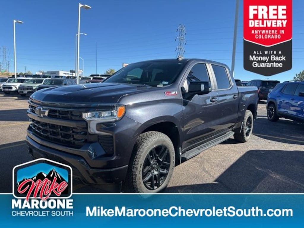 COME SEE THIS BEAUTIFUL 2022 Chevrolet Silverado 1500 RST AT MIKE MAROONE CHEVROLET SOUTH 230 N ACADEMY BLVD COLORADO SPRINGS CO, 3 DAY 150 MILE MONEY BACK GUARANTEE**, FREE DELIVERY ANYWHERE IN COLORADO**, 60 DAY POWERTRAIN WARRANTY**, CERTIFIED 1 OWNER VEHICLE**, CLEAN CARFAX - NO ACCIDENTS REPORTED**, 3 FREE MONTHS XM RADIO (IF EQUIPPED)**, 2 SETS OF KEYS**, 4 WHEEL DRIVE**, 8 COLOR TOUCHSCREEN**, APPLE CARPLAY**, ANDROID AUTO**, AIR CONDITIONING**, ALLOY WHEELS**, AUTO LOCKING REAR DIFFERENTIAL**, BLIND SPOT MONITOR**, BLUETOOTH - HANDS FREE**, BOSE PREMIUM STEREO**, FRESH OIL & FILTER CHANGE**, FRONT & REAR BRAKES**, HEATED SEATS**, HEATED STEERING WHEEL**, LANE CHANGE ALERT WITH SIDE BLIND ZONE ALERT**, LANE KEEP ASSIST**, LEATHER SEATS**, MP3- USB- AUX PORT**, PASSIVE ENTRY SYSTEM**, KEYLESS OPEN**, KEYLESS START**, KEYLESS ENTRY**, POWER HEATED OUTSIDE MIRRORS**, CRUISE CONTROL**, POWER WINDOWS**, POWER LOCKS**, POWER SEAT**, REAR BACK UP CAMERA**, REAR CROSS TRAFFIC ALERT**, REMOTE VEHICLE START**, RUNNING BOARDS**, SERVICE RECORDS AVAILABLE**, STEERING WHEEL AUDIO CONTROLS**, TOW PACKAGE**, TRAILERING EQUIPMENT**, BEDLINER**. 4WD Chevrolet Certified Pre-Owned Details: