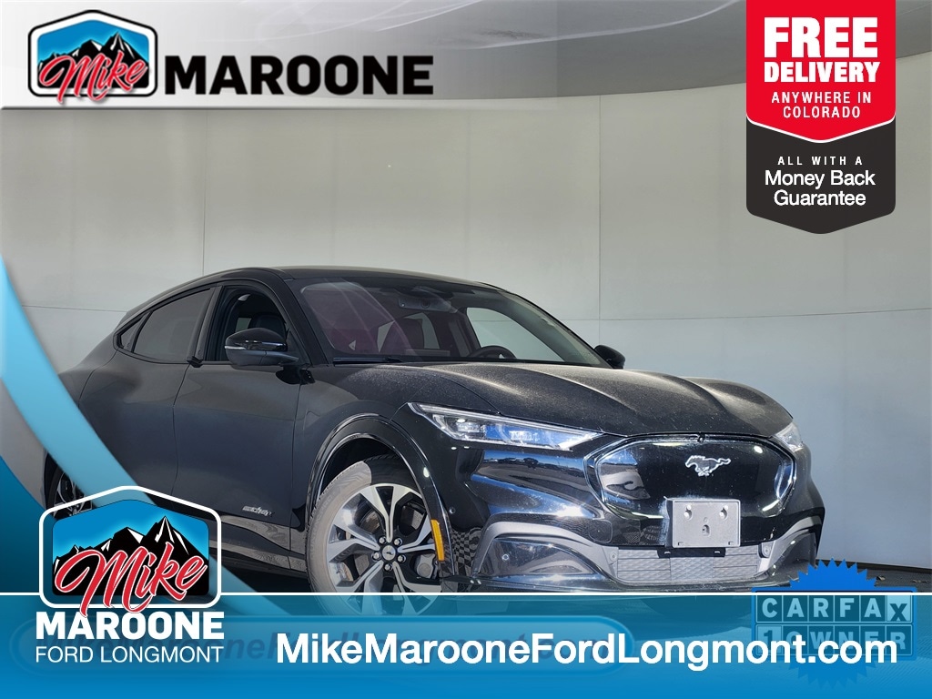 Recent Arrival at Mike Maroone Ford! CARFAX One-Owner. FREE DELIVERY ANYWHERE IN COLORADO, Used 2021 Ford Mustang Mach-E Premium AWD - Electric Performance, Premium Equipment & Options Extended Range Battery: Higher capacity for maximum driving range. AWD Capability: Enhanced traction and stability for all weather conditions. Driver Assistance: Ford Co-Pilot360 Active 2.0 Prep Package. Comfort: Heated Steering Wheel and Heated Front Seats. Technology: 15.5-inch SYNC 4A touchscreen, FordPass Connect with 4G WiFi Hotspot. Exterior: LED Projector Headlamps, Signature LED Daytime Running Lamps. Safety: AdvanceTrac with RSC (Roll Stability Control)., You Save: An estimated $3,750 in fuel costs over five years compared to the average new vehicle!. Shadow Black 2021 Ford Mustang Mach-E Premium 4D Sport Utility Dual Electric Motor Single-Speed Automatic AWD